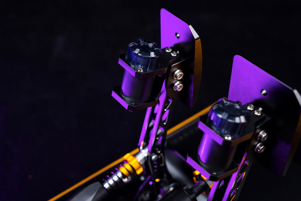 Wir sind froh, dass sie das Chassis nicht angefasst haben. Das CNC-gefräste 6061-T6 Aluminium war schon bei der V1 «bombproof». Auch das M‑DVF Vibrationsmodul ist wieder an Bord – für uns nach wie vor eines der besten Features, um ABS-Einsatz oder blockierende Räder via SimHub direkt am Fuss zu spüren. Das ist kein Spielzeug-Rumble, sondern echtes Feedback.